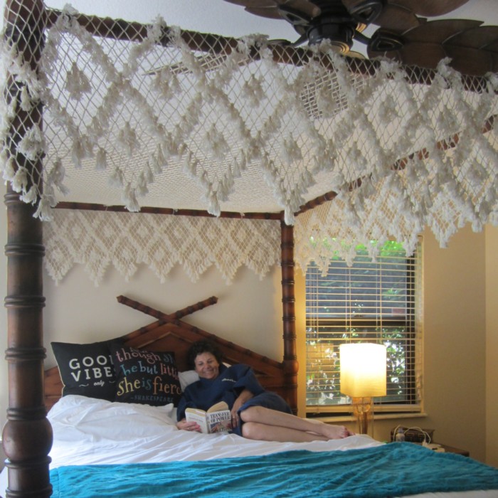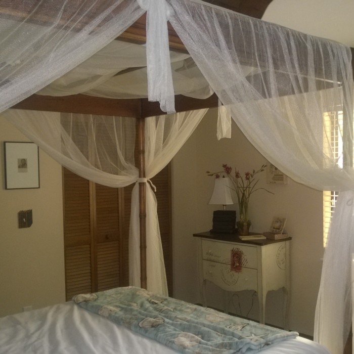 Amenities: Queen rattan canopy bed; clock radio; USB outlets; twin closets. Linens: luxury ultrasoft, tropical weight linens with tropical-weight duvet, extra blanket. Mattress: extra firm, pillow-top, cool gel foam, encased inner-spring with bamboo cover wit Amish wood foundation, made-in-USA with no ozone depleters, PBDE flame-retardants, mercury, lead or other heavy metals.