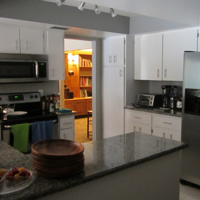 Amenities: New stainless steel appliances; icemaker with ice water, cube & crushed ice; glass-top electric stove; granite countertops; Ninja coffee bar; expresso maker; blender; toaster oven; place settings for six, wineglasses, pots & pans, tea kettle, slow cooker; ice cream maker; colander, cutting boards & knives; and more. Seating for 4, room for 6.